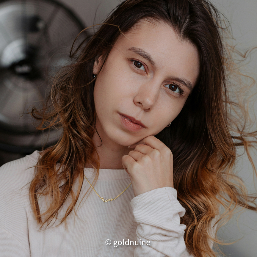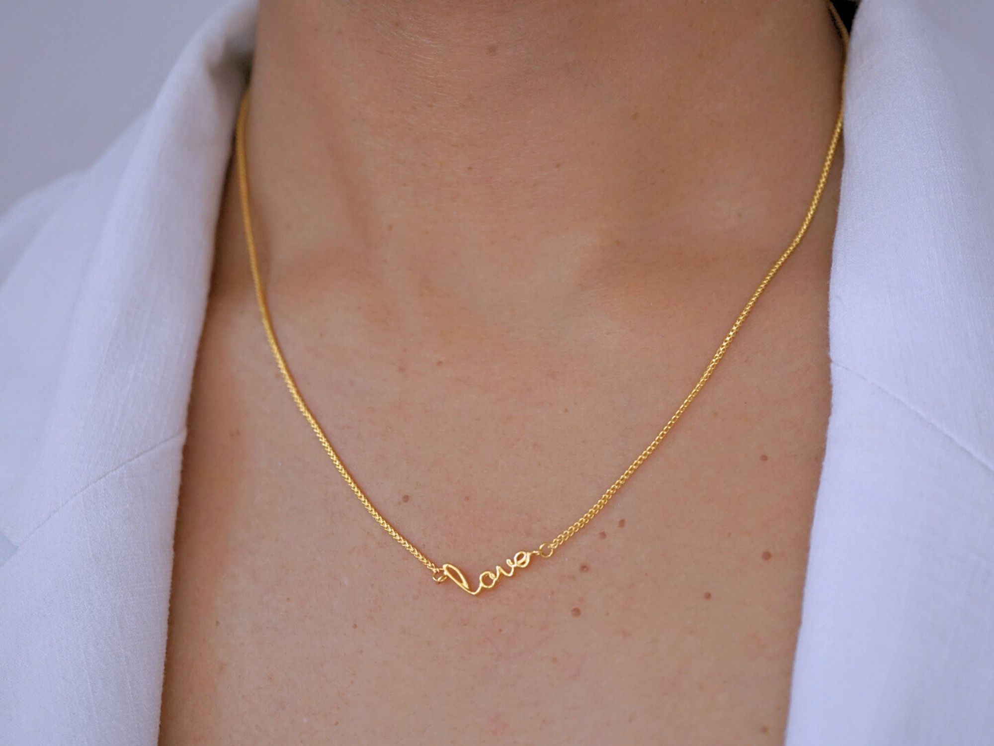 Celebrate romance and elegance with this 22K solid gold Love pendant necklace. Crafted in 96.5% real gold, the pendant spells out “Love” in a delicate script, suspended from a matching 17 inch dainty gold chain. Minimal yet meaningful, this piece makes a timeless expression of affection, perfect for everyday wear or as a heartfelt gift.