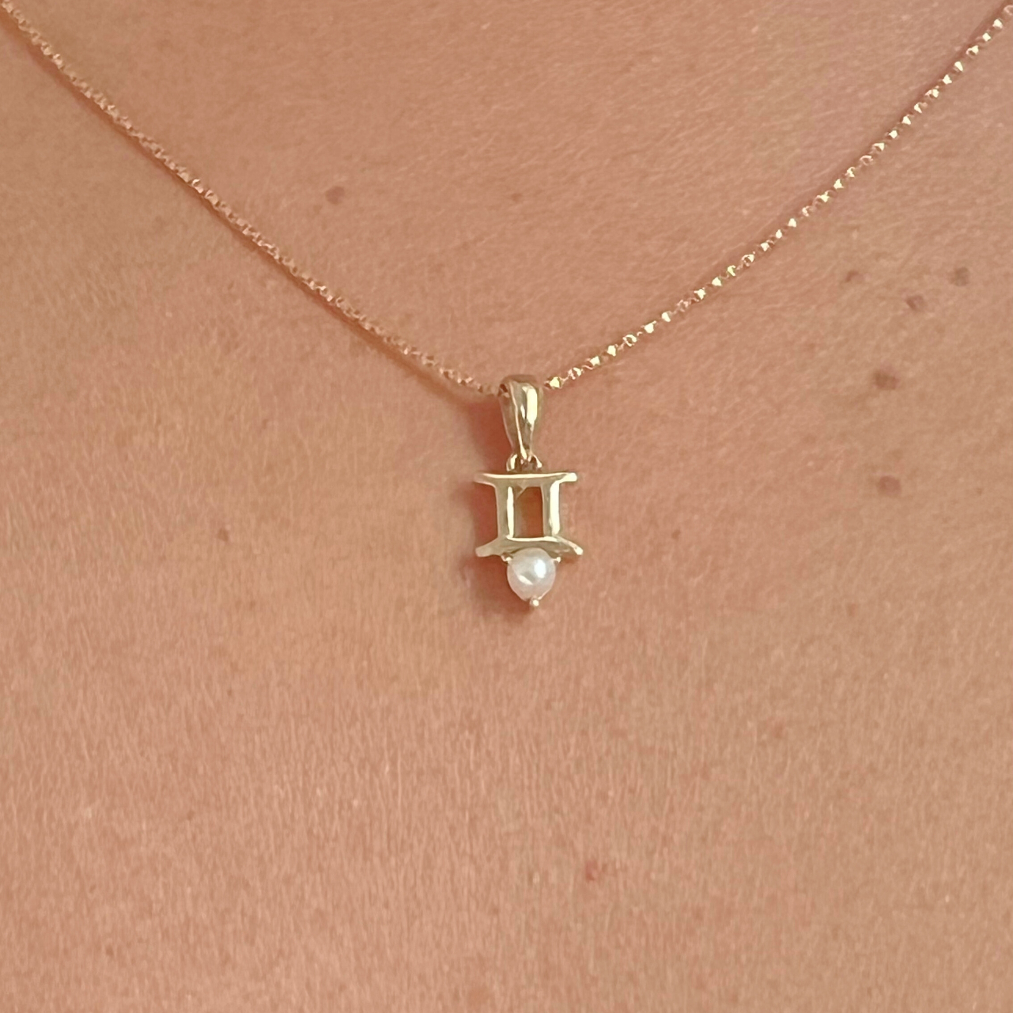 Gemini with Pearl Pendant, 10K Solid Gold, Dainty Gold Necklace