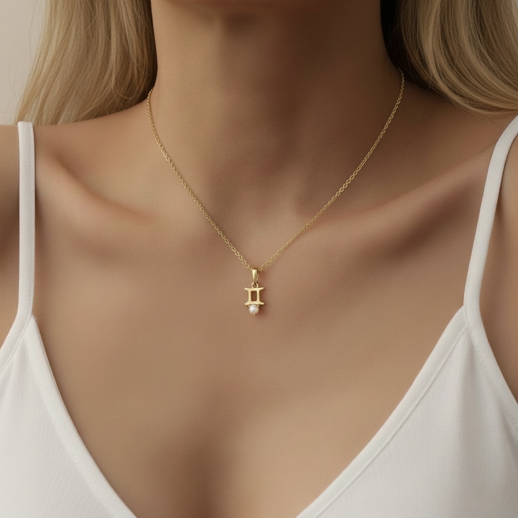 Celebrate duality, creativity, and balance with this 10K solid gold Gemini pendant necklace. Crafted in Au 417 real gold, the pendant features the Gemini Twins zodiac symbol adorned with a natural pearl, June’s traditional birthstone. Pearls are known for their purity and wisdom, making this necklace a meaningful piece of fine jewelry for those born between May 21 – June 20 or anyone who resonates with Gemini’s versatile spirit.