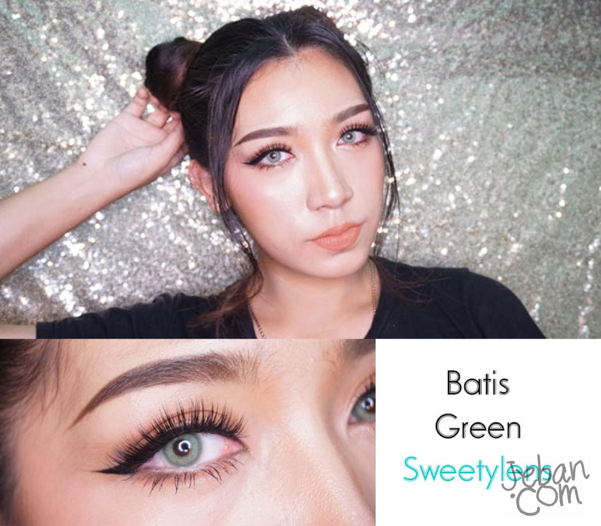 Pitchy Batis Green Monthly Colored Contacts feature limbal ring, spots, and realistic green blend. Bold, natural eyes in plano & prescription (0.00 to -10.00).