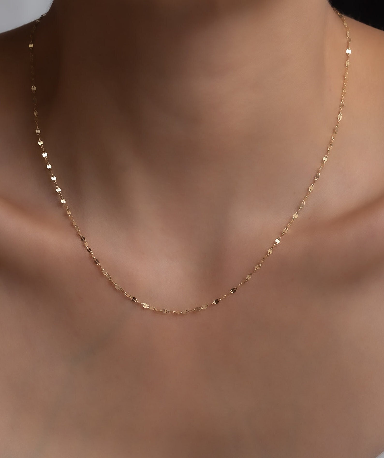 Shine with elegance in this 18K solid gold sparkle chain necklace, available in both 18K yellow gold and 18K white gold. Crafted in Au 750 real gold, the kiss link collar design creates a unique sparkle effect that catches the light beautifully with every movement. Available in 16, 18, and 20 inches, this dainty yet durable chain makes the perfect everyday luxury or a stunning layering piece.