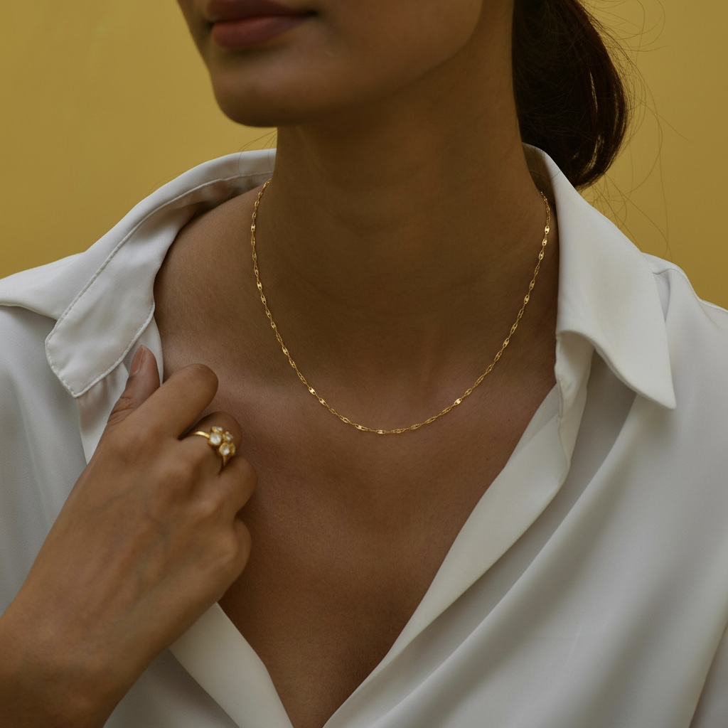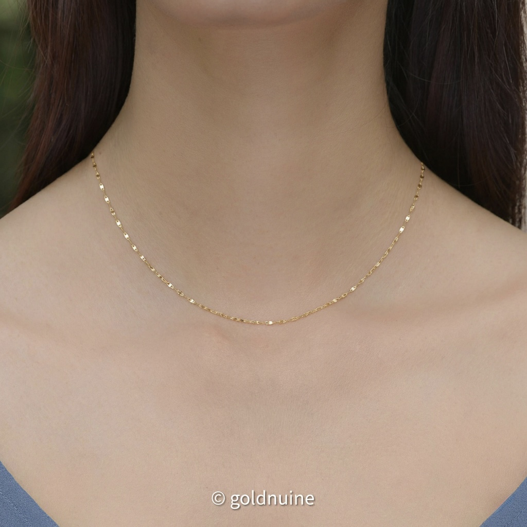 Add subtle brilliance to your everyday style with this 9K solid gold sparkle chain necklace. Crafted in Au 375 real gold, the collar-style kiss link design reflects light beautifully with each movement, giving it an elegant shimmer without being overpowering. Available in 16, 18, or 20 inches, this dainty chain is perfect for wearing alone or pairing with a pendant for a refined look.