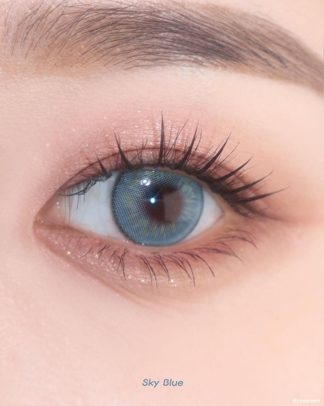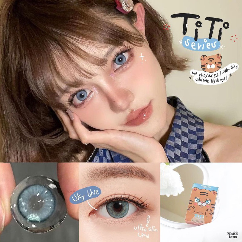 Get Titi Sky Blue 6-Month Colored Contacts. Achieve a vibrant sky blue gaze & eye enhancement. Designed for half-yearly wear. Available plano & prescription (0.00 to -10.00).